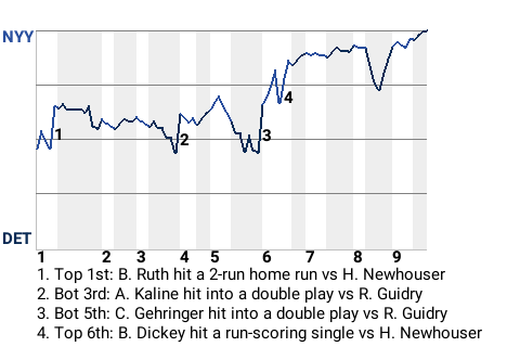 With New York leading 2-1 in the top of the sixth, Bill Dickey hit a run-scoring single off Detroit pitcher Hal Newhouser. It put the Yankees ahead 3-1.