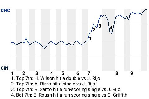 Chicago Cubs starter Clark Griffith pitched well against the Cincinnati Reds at Great American Ball Park, leading his team to a win, 3-1. The winner was Griffith. He threw 8.0 innings of 4-hit ball. The loser was Jose Rijo. The setback makes Cincinnati 65-67.