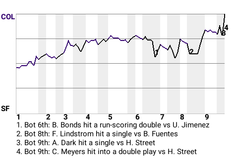 With scoring opportunities rare, the Rockies had to cash in when they had the chance. One such opportunity presented itself in the top of the third, when second baseman DJ LeMahieu hit a run-scoring single. The single came off Carl Hubbell and made the score 2-0, Rockies. LeMahieu went 2 for 4 with 2 singles.