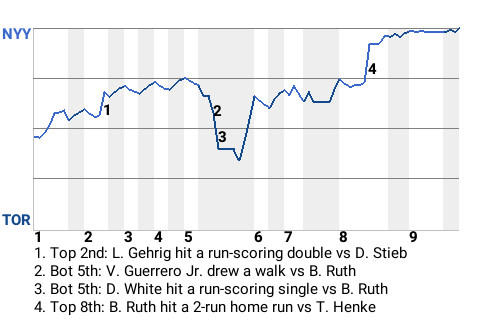 The New York Yankees dealt the Toronto Blue Jays a 5-1 loss at Rogers Centre. Babe Ruth was the star on offense. He threw 7.1 innings of 1-hit ball. The loss makes Toronto 71-63.