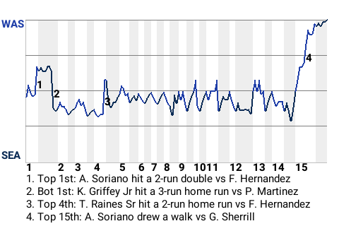The Washington Nationals overcame a good performance by Seattle center fielder Ken Griffey Jr to knock off Seattle, 7-4, in 15 innings at Safeco Field. Griffey Jr hit 2 home runs. He drove in 4 runs and scored twice. Washington reliever Jeff Fassero picked up the win, upping his record to 1-0. George Sherrill was saddled with the loss. Chad Cordero closed it out for Washington, earning his 1st save.