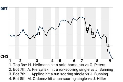 The White Sox beat the Tigers in part due to timely hitting. Case in point: the two-out single Magglio Ordonez produced in the bottom of the eighth. Batting against John Hiller, Ordonez gave his team the lead, 3-2, when he hit a run-scoring single.