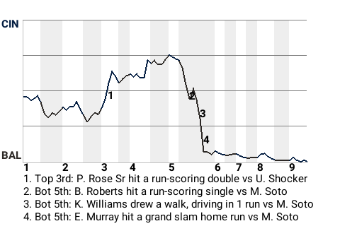 Baltimore grabbed the momentum in the bottom of the fifth, when Murray hit a grand slam home run off Mario Soto. His 24th home run of the season put the Orioles out in front, 7-3.