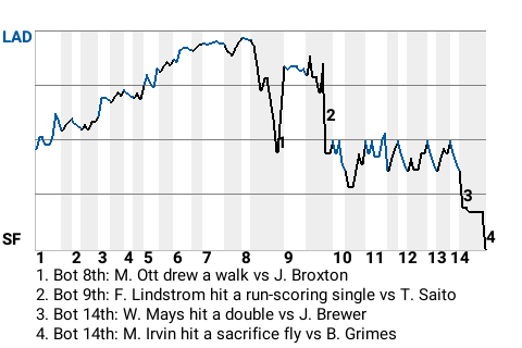 The clutch at-bat came in the bottom of the 14th inning, when San Francisco left fielder Monte Irvin, facing Burleigh Grimes, had a run-scoring sacrifice fly. It gave the Giants the 5-4 win.