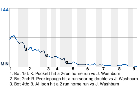 Kirby Puckett took Los Angeles hurler Jarrod Washburn deep in the bottom of the first. His 2-run home run put the Twins on top, 2-0. In all, Puckett had 1 single in addition to the home run, while going 2 for 4.