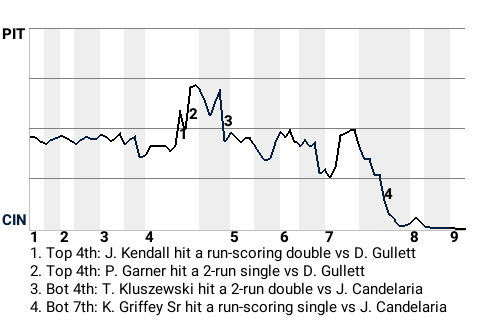 Cincinnati right fielder Ken Griffey Sr helped the Reds go up, 5-4, in the bottom of the seventh inning. With the game tied, Griffey Sr hit a run-scoring single off Pittsburgh pitcher John Candelaria.