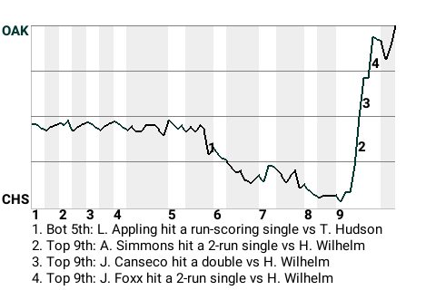 The game was at a stalemate until first baseman Jimmie Foxx came to bat in the top of the ninth. Facing Chicago pitcher Hoyt Wilhelm, he hit a full count knuckleball for a 2-run single. It was a game-changer, putting Oakland on top, 5-3.