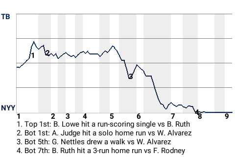 With New York leading 5-2 in the bottom of the seventh, Ruth hit a changeup from Fernando Rodney for a 3-run home run. It was his 33rd home run of the season and put the Yankees ahead, 8-2.
