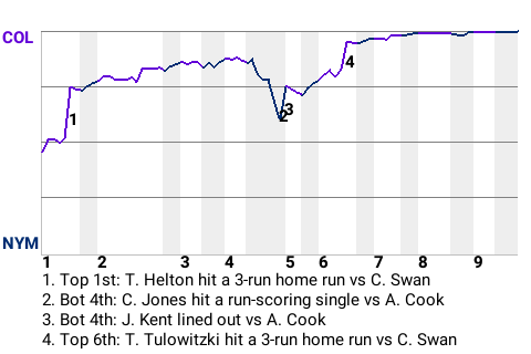 The Colorado Rockies picked up a win, 8-2, over the New York Mets at Citi Field. Todd Helton led the charge. The Knoxville, Tennessee native was 2 for 3 with a home run and 2 walks. He scored 2 runs and drove in 3 for Colorado. The Rockies go to 53-93, putting them last in the National League Western Division.