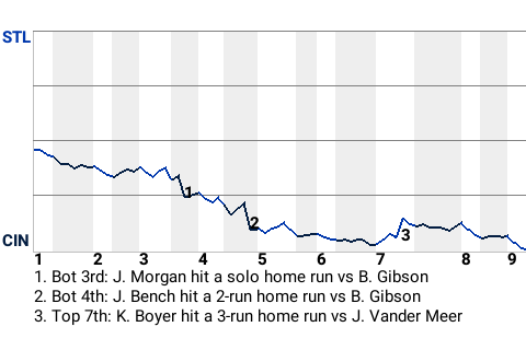 Johnny Bench had a big 2-run home run for the Reds in the bottom of the fourth inning. With Cincinnati leading 2-0 and a runner on 2nd, he sized up a fastball from Bob Gibson, who is tied for 8th in the NL in strikeouts with 172, and punished it. The result was his 16th home run of the season, which put the Reds on top, 4-0.