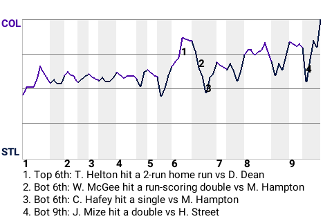 Todd Helton, who is tied for 7th in the NL with a .831 OPS, had a direct impact on the outcome. Helton contributed a 2-run home run in the top of the sixth inning to put Colorado up, 3-0.