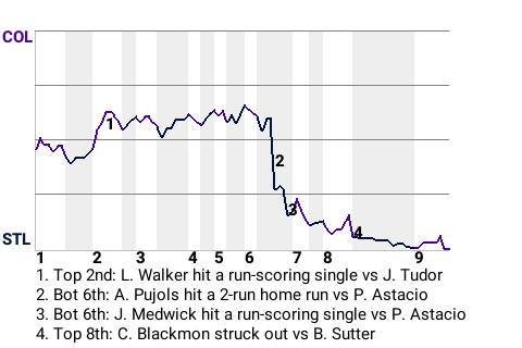 In the bottom of the sixth, St. Louis first baseman Albert Pujols put his team on top. With one out and a runner on 1st, he hit his 11th home run of the year. Colorado pitcher Pedro Astacio served it up. Just like that, the Cardinals were ahead, 2-1.