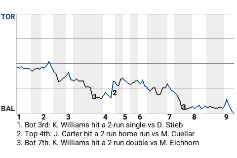 Baltimore took a 5-2 lead on Ken Williams's 26th double of the season. The 2-run double, which Williams hit in the bottom of the seventh, left Toronto pitcher Mark Eichhorn shaking his head.
