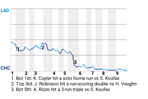 The Cubs got a big hit from first baseman Anthony Rizzo. Facing Los Angeles pitcher Sandy Koufax in the bottom of the fifth, Rizzo pounded a 2-run triple to right. His 3rd triple of the season put the Cubs ahead, 4-1.