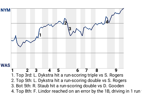 The Mets benefited from a costly error in the top of the eighth. With Francisco Lindor at bat and New York leading 3-2, the Washington miscue allowed New York to plate 1 and take the lead, 4-2.