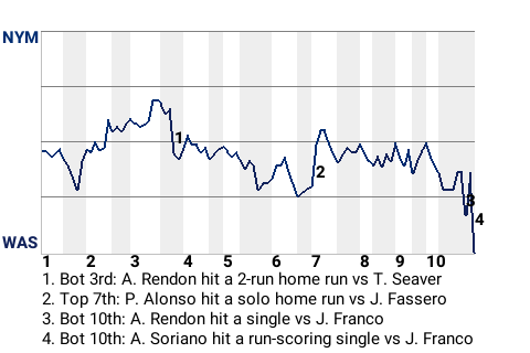 The Nationals procured the win, in large part because of second baseman Alfonso Soriano. In the bottom of the tenth, he produced the game-winning run-scoring single.