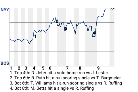 Babe Ruth dealt the Red Sox a blow in the top of the sixth. Batting with the bases loaded and New York leading 1-0, Ruth, who is tied for 5th in the AL in home runs with 36, hit a 2-2 fastball for a run-scoring single.