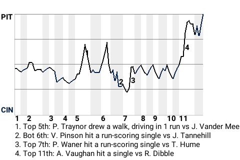The game was at a stalemate until catcher Jason Kendall came to bat in the top of the 11th. Facing Cincinnati pitcher Aroldis Chapman, he hit a first pitch fastball for a run-scoring single. It was a game-changer, putting Pittsburgh on top, 3-2.
