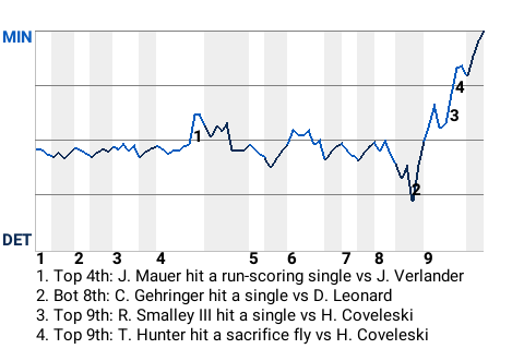 Torii Hunter had a direct impact on the outcome. Hunter contributed a run-scoring sacrifice fly in the top of the ninth inning to put Minnesota up, 2-1.