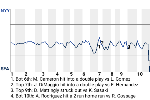 Seattle got a clutch hit from Alex Rodriguez. The shortstop launched a 2-run home run in the bottom of the tenth inning to win the game. It was his only hit in 4 at-bats, but it was a kill shot.