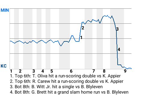 Kansas City went up, 4-2, on George Brett's 2nd home run of the season. The grand slam home run, which Brett hit in the bottom of the eighth, left Minnesota pitcher Bert Blyleven shaking his head.