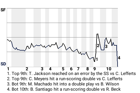 The decisive blow was delivered by Benito Santiago in the bottom of the tenth when he hit a run-scoring double off 23-year old right-handed pitcher Rod Beck to win the game for San Diego. The home crowd went nuts.
