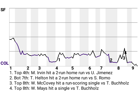 Colorado took a 7-4 lead on Helton's 2nd home run of the season. The 2-run home run, which he hit off Sergio Romo in the bottom of the seventh, propelled Colorado to the win.