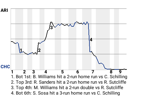 Sammy Sosa took Arizona hurler Curt Schilling deep in the bottom of the sixth. His 3-run home run put the Cubs on top, 5-4. In all, Sosa had 1 single in addition to the home run, while going 2 for 4.