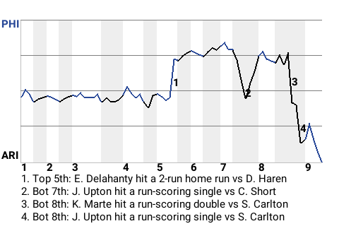 The Diamondbacks beat the Phillies in part due to timely hitting. Case in point: the two-out single Justin Upton produced in the bottom of the eighth. Batting against Steve Carlton, Upton gave his team the lead, 3-2, when he hit a run-scoring single.