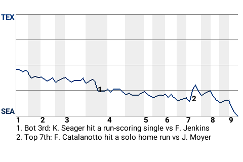 Seattle third baseman Kyle Seager contributed a timely at-bat in the bottom of the third. With two down, he hit a curveball to center field for a run-scoring single. It was his 24th hit of the season and put the Mariners ahead, 2-0.