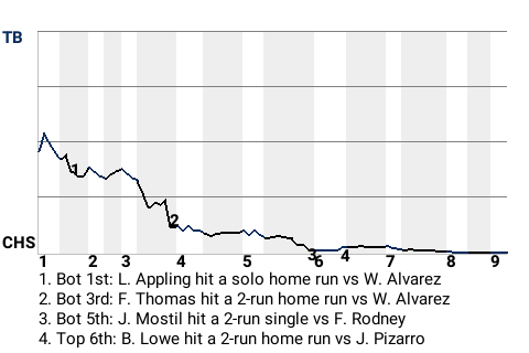 The Chicago White Sox beat the Tampa Bay Rays by a score of 8-2. Chicago first baseman Frank E Thomas deserved the lion's share of the credit. Thomas was 3-3 with a home run, 2 singles, and a walk, while scoring 3 times and driving in 2 for the White Sox. Juan Pizarro got the win, improving to 2-2. He pitched 8 innings, giving up 5 hits and 2 runs, while striking out 7 and walking 1. Tampa Bay falls to 12-12.
