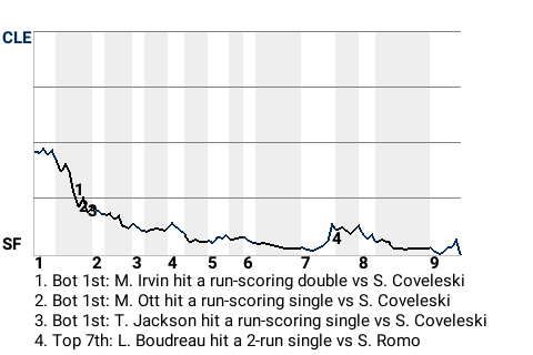The Giants had to work out of trouble in the top of the ninth. The score was 7-5, San Francisco, with two out. Cleveland, with runners on 1st and 3rd, was mounting a threat. Larry Doby dug in at the plate, but on a full count slider, he flied out.