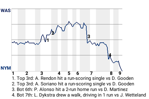 The New York Mets got a strong performance from pitcher Dwight Gooden, who stymied the Washington offense en route to a win, 3-2, at Citi Field. Skip Lockwood earned the save for New York, his 1st. The win puts New York at 2-0.