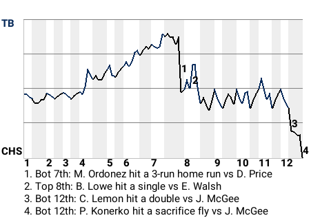 The Chicago White Sox had to overcome a fine effort from Tampa Bay pitcher David Price to win, 4-3, in 12 innings at U.S. Cellular Field. Price went 7.2 innings and allowed 3 runs. Chicago pitcher Wilbur Wood earned the win, hiking his record to 2-1. Jake McGee suffered the loss. The Rays drop to 12-14 and continue their mediocre start to the 2014 season.