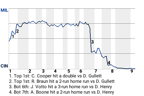 In the bottom of the sixth, the Reds grabbed the lead when Votto hit his 7th home run of the season. The 3-run home run off Doug Henry made it 4-3, Cincinnati.