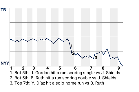 With New York leading 1-0 in the bottom of the fifth, Ruth hit a curveball from James Shields for a run-scoring double. It was his 4th double of the season and put the Yankees ahead, 2-0.