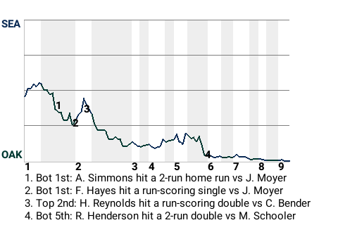 Al Simmons took Seattle hurler Jamie Moyer deep in the bottom of the first. His 2-run home run put the Athletics on top, 2-1. In all, Simmons had 1 single in addition to the home run, while going 2 for 5.