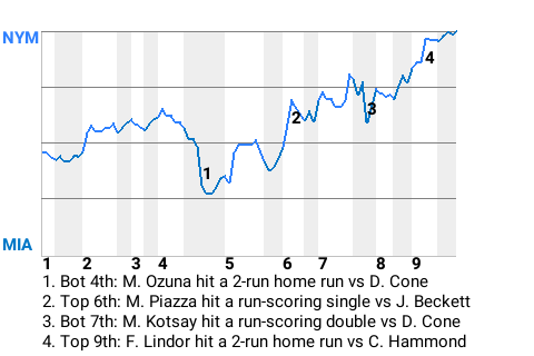 David Cone, who is tied for 6th in the NL in wins with 4, propelled his team to victory over the Miami Marlins. The final score was 6-3, New York. The Mets, at 21-13, lead by one game in their division.