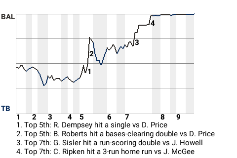 Behind the bravura of shortstop Cal Ripken, the Baltimore Orioles topped the Tampa Bay Rays by the score of 9-2. Ripken was 3 for 5 with a home run and 2 singles, while scoring 2 and driving in 3 for the Orioles. Urban Shocker, the winner, improved to 3-2. He held the Rays to 2 runs on 6 hits over 8.2 innings, while striking out 6 and walking 1. The Rays, now 16-20, have lost 6 in a row.