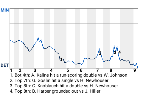 Al Kaline had a big run-scoring double for the Tigers in the bottom of the fourth inning. With Detroit leading 1-0 and runners on 1st and 2nd, he got a fastball from Walter Johnson and swatted a double to right-center. It was his 7th double of the season, and more importantly, it put the Tigers ahead, 2-0.