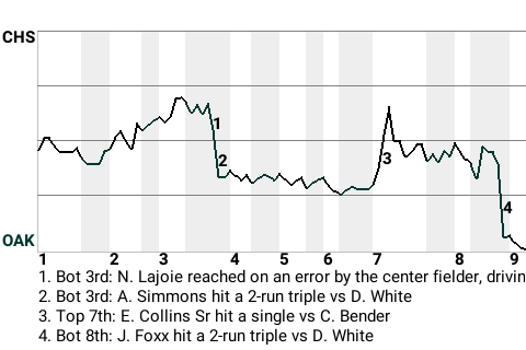 Oakland went in front, 5-3, on Jimmie Foxx's 2nd triple of the season. The 2-run triple, which Foxx hit in the bottom of the eighth, left Chicago pitcher Doc White visibly perturbed.