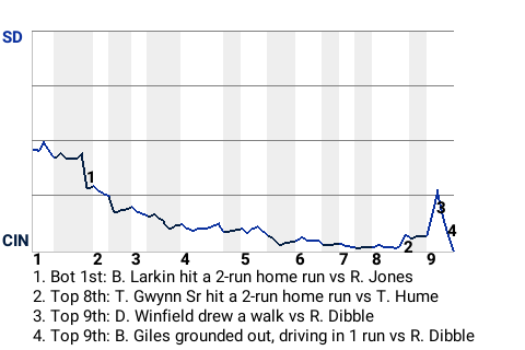 The Reds got a big at-bat from shortstop Barry Larkin. For the game, Larkin was 1 for 3 with a home run. He drove in 2 runs and scored once. In the bottom of the first, with a runner on 1st, he stroked a 2-run home run. His 3rd home run of the season gave Cincinnati a 2-0 lead.