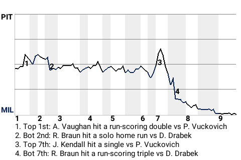Milwaukee went up, 2-1, on Ryan J Braun's 1st triple of the season. The run-scoring triple, which Braun hit in the bottom of the seventh, left Pittsburgh pitcher Doug Drabek shaking his head.
