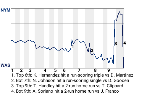 Washington got a clutch hit from Alfonso Soriano. The second baseman launched a 2-run home run in the bottom of the ninth inning to win the game. It was his only hit in 4 at-bats, but it was a kill shot.