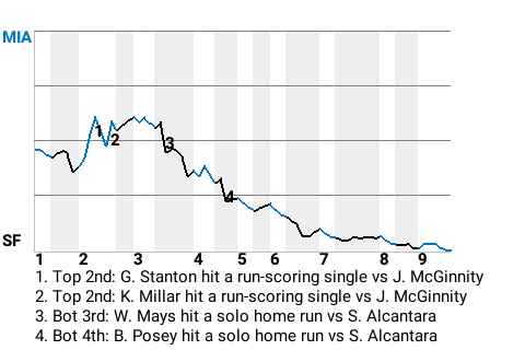 Buster Posey had a big solo home run for the Giants in the bottom of the fourth inning. With San Francisco leading 3-2 and the bases empty, he sized up a slider from 26-year old right-handed pitcher Sandy Alcantara and punished it. The result was his 5th home run of the season, which put the Giants on top, 4-2.