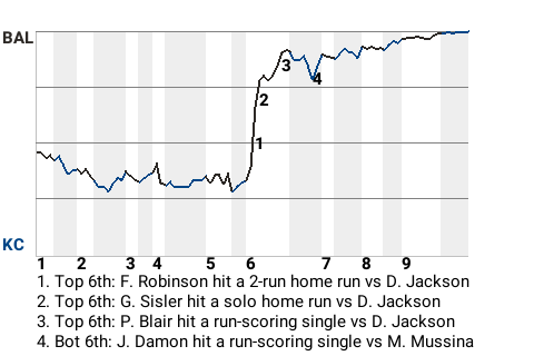 Frank Robinson, who is tied for 3rd in the AL in extra base hits with 22, took Kansas City hurler Danny Jackson deep in the top of the sixth. His 2-run home run put the Orioles on top, 2-1. In all, Robinson had 1 single in addition to the home run, while going 2 for 4.