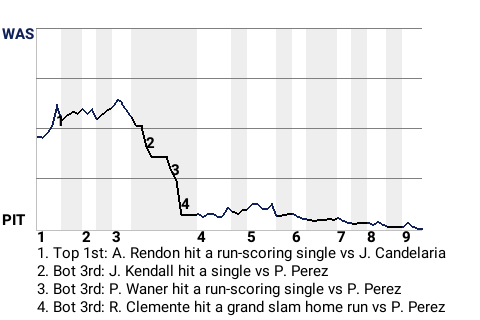With Pittsburgh leading 2-1 in the bottom of the third, Clemente came up to bat against Washington pitcher Pascual Perez. Clemente hit a slider to left for a grand slam home run. His 3rd home run of the season put the Pirates on top, 6-1.