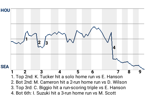 The Mariners got a big hit from right fielder Ichiro Suzuki. In the bottom of the sixth, Suzuki smacked a 3-run home run off Houston pitcher Mike Scott. It was his 4th home run of the season. Suddenly, the Mariners were ahead, 5-3.