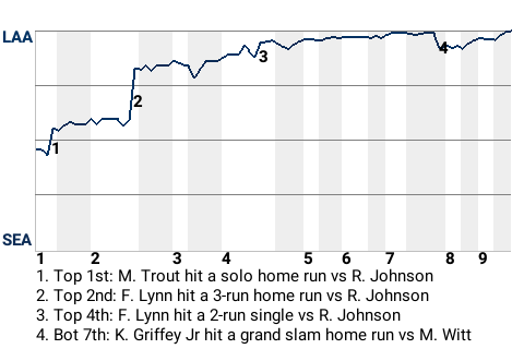 With Los Angeles leading 1-0 in the top of the second, Lynn batted against Seattle pitcher Randy D Johnson. Lynn hit a slider to right-center for a 3-run home run. His 6th home run of the season put the Angels on top, 4-0.