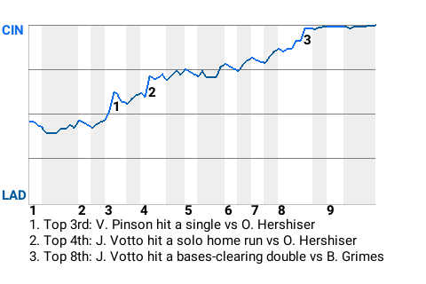 Vander Meer was in the zone all game. He frustrated Los Angeles hitters while giving the Reds 8 innings of quality work. Vander Meer threw 116 pitches, allowing 2 hits and getting 7 punchouts.